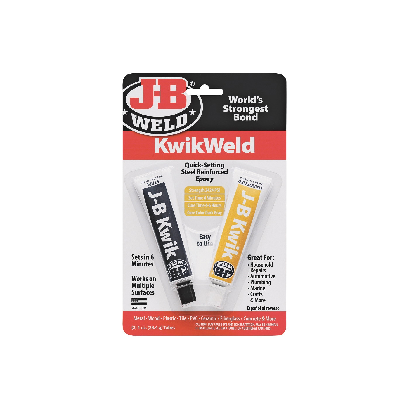 KwikWeld Professional is a professional-sized version of our fast setting KwikWeld™ two-part epoxy cold weld system. It provides strong, lasting repairs to metal and multiple other surface types. After mixing, it forms a permanent bond and can be shaped, tapped, filed, sanded and drilled after curing. KwikWeld™ has a 1:1 mixing ratio, sets in 6 minutes and is fully cured in 4-6 hours. KwikWeld™ cures to a dark grey color, is rated at a tensile strength of 3127 PSI and will withstand temperatures up to 300ºF.