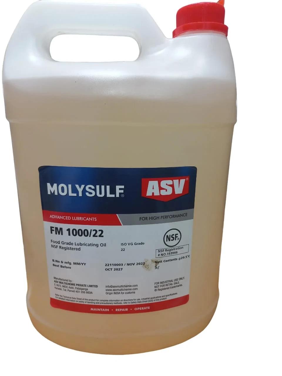 FM 1000 series oils are highly effective extreme pressure capable food machinery lubricating fluids based on USP grade white oils for providing high performance under severe operating conditions. Formulated with a selected blend of premium grade additives for high load carrying, high temperature oxidation and corrosion protection, these oils are designed for maximum performance under the most demanding operating conditions. High degree of thermal & oxidation stability allows for extended lubrication, increase in re-lubrication intervals and reduction in lubricant costs. Meet requirements of NSF H-1(lubricants with incidental food contact).