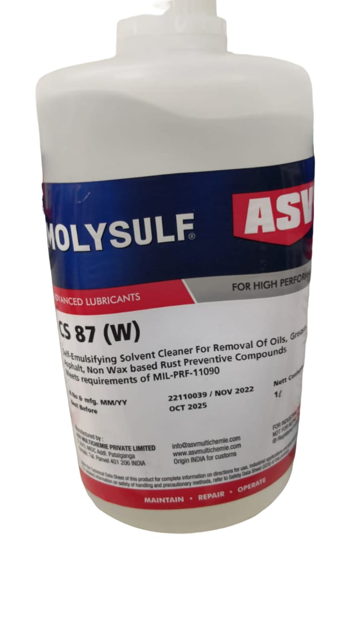 ASV® CS 87 is a non chlorinated, cleaner / degreaser for mechanical cleaning applications as an alternative for chlorinated solvents like CTC, 1,1,1 Trichloroethane. Safety standards from both, worker health as well as environmental, prohibit the use of chlorinated solvents like CTC or 1,1,1 TCE. ASV® CS 87 rapidly penetrates through grease, oil, dirt, dust and other contaminants and cleans equipment fast. It cleans metal surfaces effectively due its superior penetrating and wetting ability. On addition to water, it seeks out grease and heavy contaminants to effectively break them down and completely removes them. It is a residueless cleaner and does not contain any acids, phosphates, harmful chemicals or alkalis.