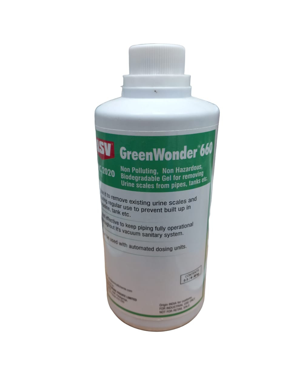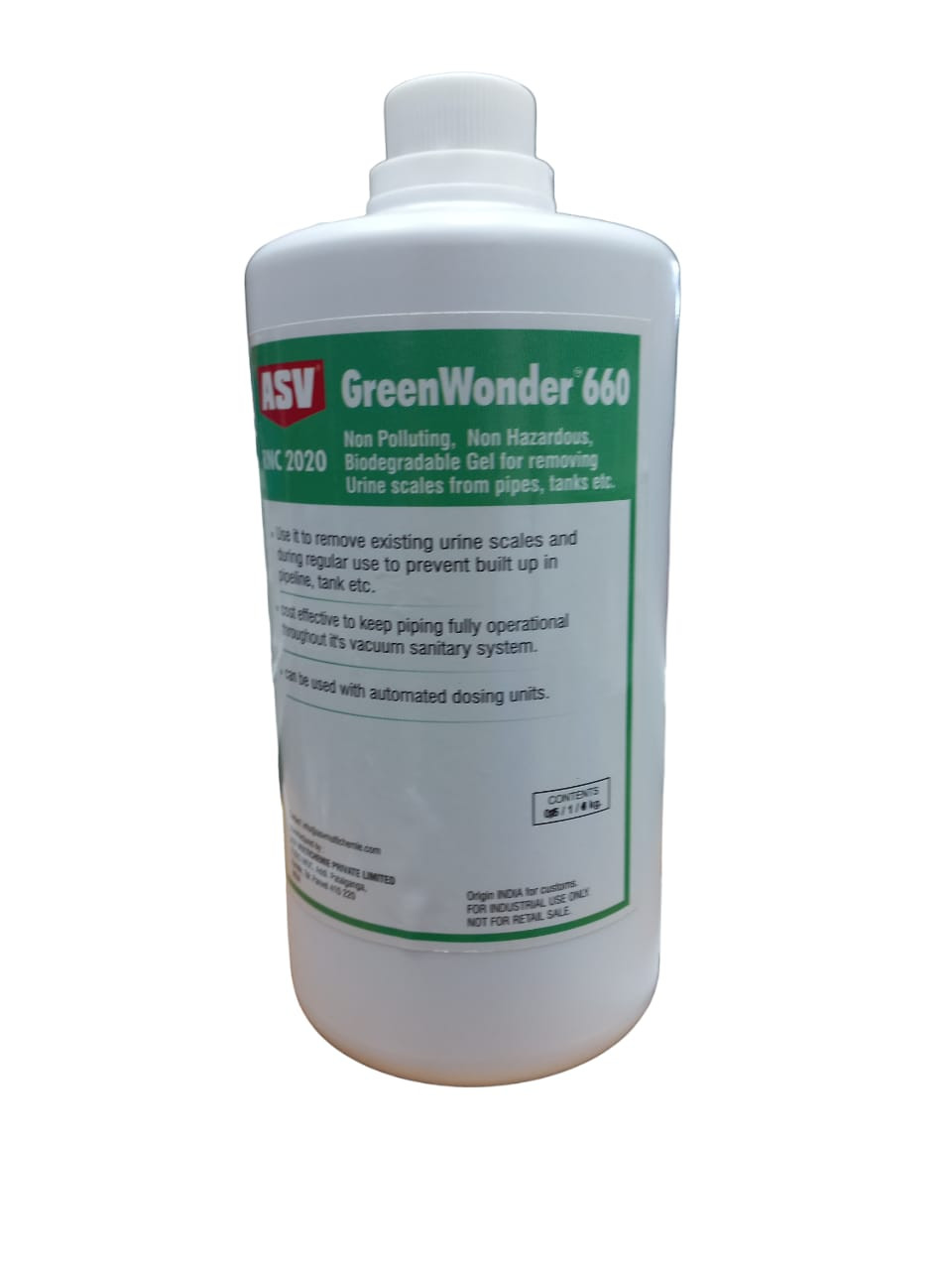 Urine scale is a hard substance which forms in piping systems due to a chemical reaction between the calcium in water and urine. A special cleaning agent is needed to prevent and remove such scale. RNC 2020 GREENWONDER 660 product is specially formulated for this task. It offers a cost-effective way to keep the piping fully operational throughout the life of your vacuum sanitary system. Prevents and removes urine scale substance which forms in piping systems due to a chemical reaction between the calcium in water and urine. Use them with automated dosing units to optimize their effectiveness in any vessel